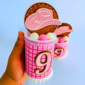 Vista em ângulo do cofrinho de luxo personalizado, mostrando todos os detalhes do tema Ana Castela.