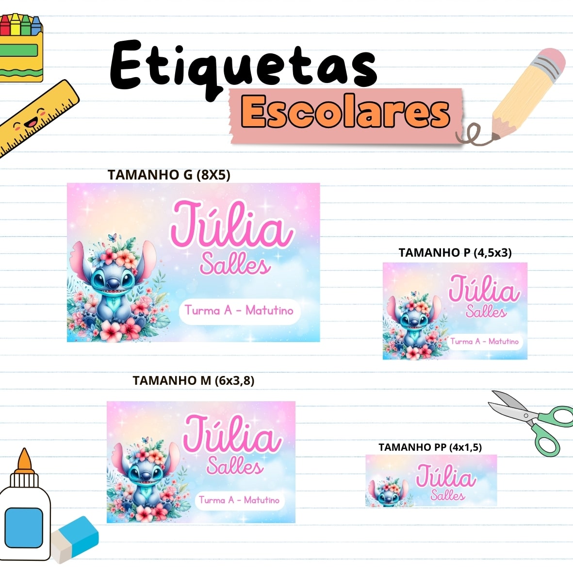 Faça da volta às aulas um momento especial! Adquira agora o Kit Escolar Personalizado e proporcione às crianças uma experiência única e cheia de estilo.Garanta a organização do material escolar do seu pequeno com nosso Kit de Etiquetas Escolares! Feitas em papel fotográfico de alta qualidade, nossas etiquetas são a escolha perfeita para personalizar os pertences da criançada