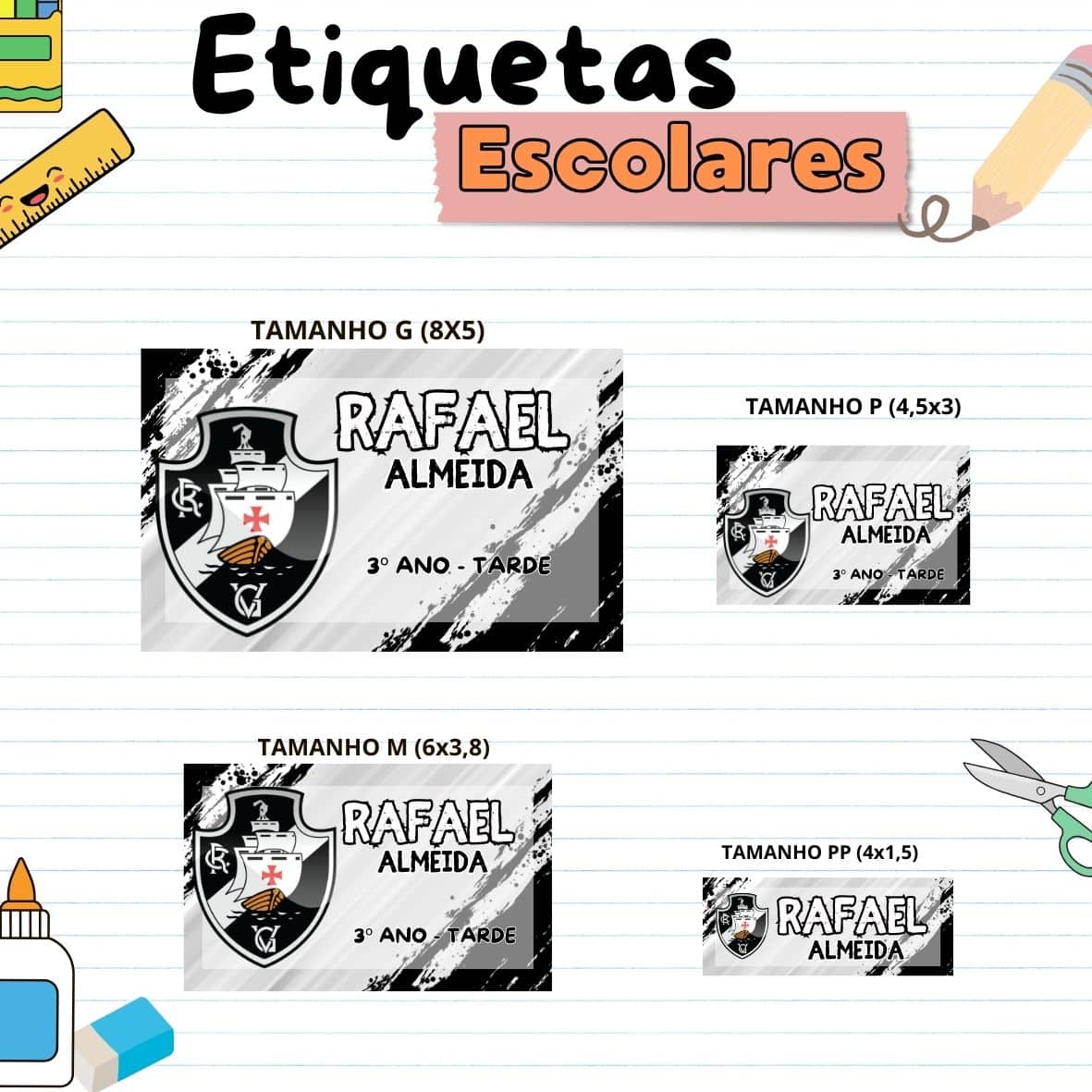 Faça da volta às aulas um momento especial! Adquira agora o Kit Escolar Personalizado e proporcione às crianças uma experiência única e cheia de estilo.Garanta a organização do material escolar do seu pequeno com nosso Kit de Etiquetas Escolares! Feitas em papel fotográfico de alta qualidade, nossas etiquetas são a escolha perfeita para personalizar os pertences da criançada
